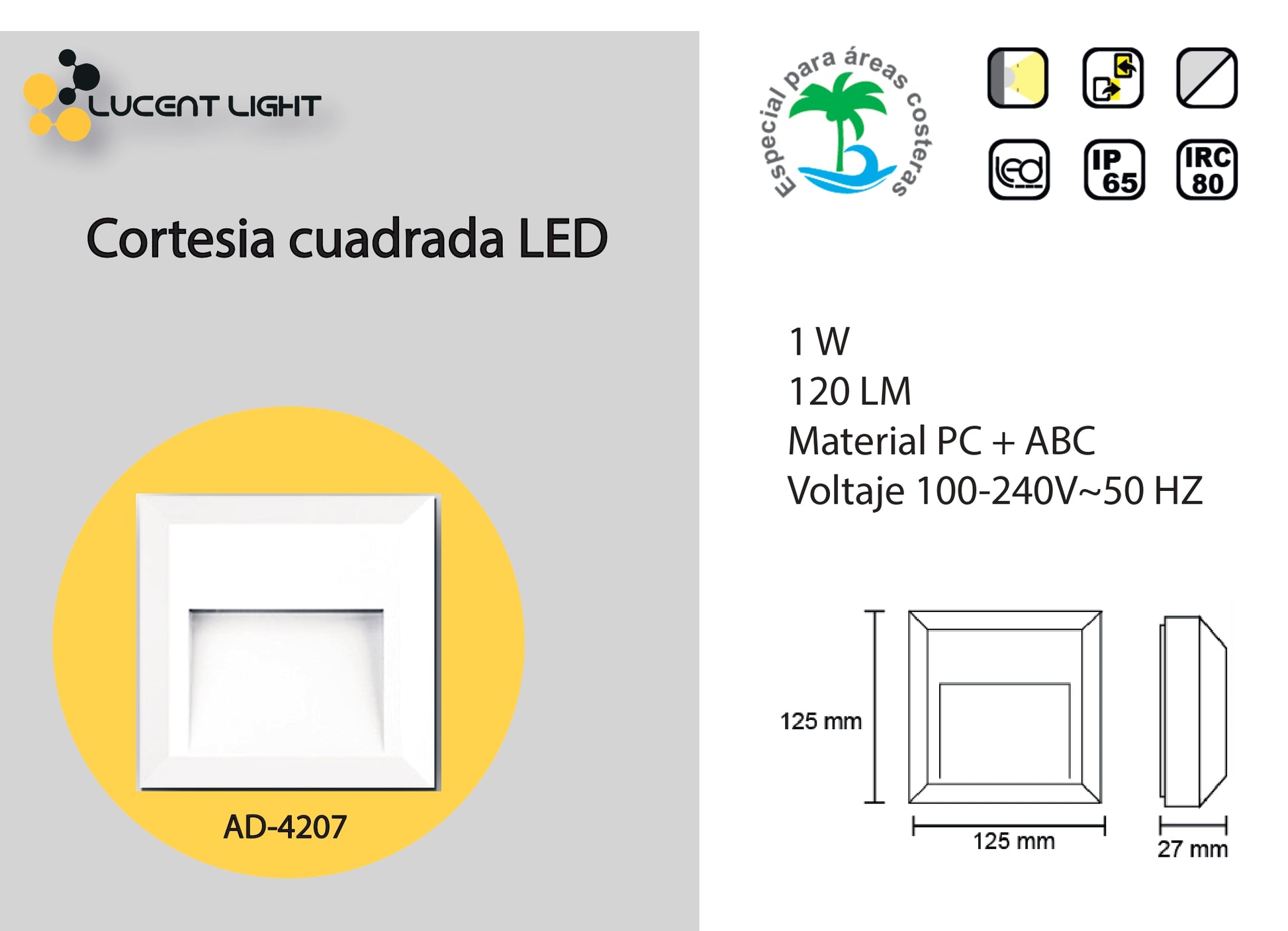 La "Cortesía Cuadrada LED" es una luminaria moderna y elegante diseñada para proporcionar una iluminación eficiente y de alta calidad en una variedad de espacios. Su forma cuadrada y compacta la hace ideal para instalaciones en interiores como pasillos, entradas, oficinas y áreas comunes. Equipada con tecnología LED, ofrece una luz brillante, de bajo consumo energético y larga duración.